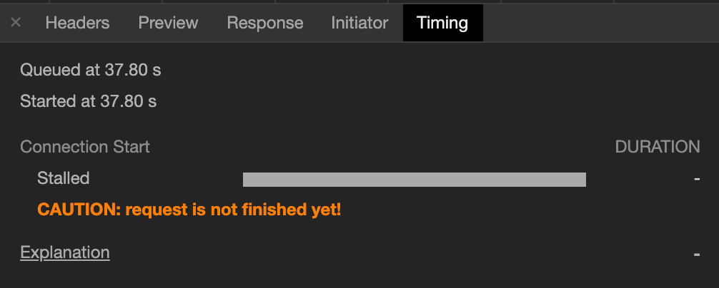 詳細測試後此情況僅在 Chrome 發生此狀況,進一步使用 chrome://net-export/ 查詢 network log,看起來 chrome 確實發送 request 後就無任何回應,更進一步使用在 server 端檢查 access.log 卻是沒收到任何 request.