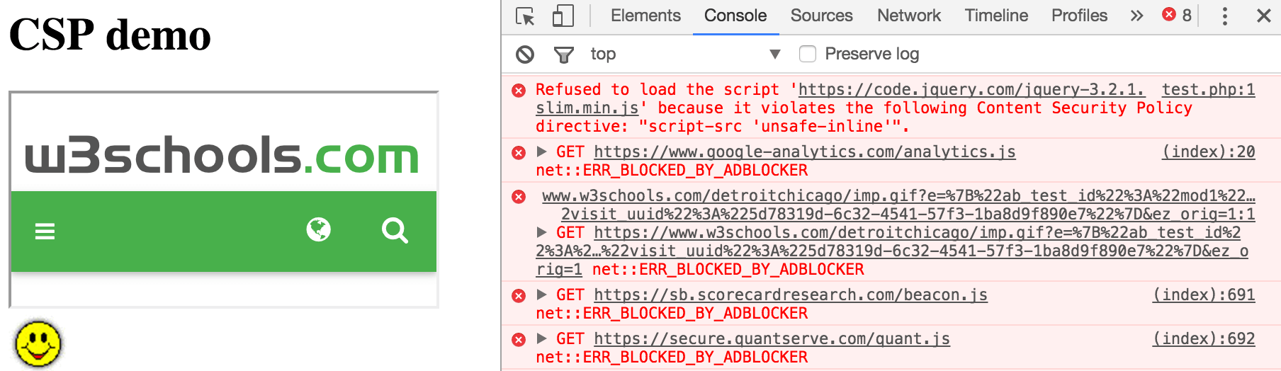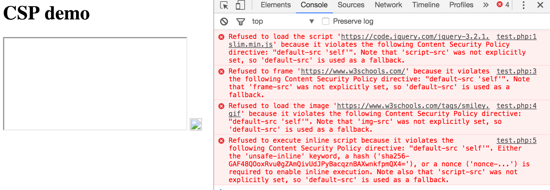 header("Content-Security-Policy: default-src 'self'"); print "<h1>CSP demo</h1> <script src='https://code.jquery.com/jquery-3.2.1.slim.min.js'></script> <iframe src='https://www.w3schools.com'></iframe> <img src='https://www.w3schools.com/tags/smiley.gif'> <script>alert('test');</script>";