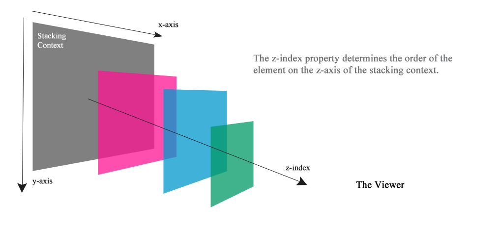 你可以想像網頁上除了二維空間以外,還有一個第三維的 z 軸,在 z 軸上的值也就是所謂的 z-index。所有的元素在這個空間中,除了二維的排序外,還會根據 z 軸有一定的排序,我們稱這個空間為 stacking context。