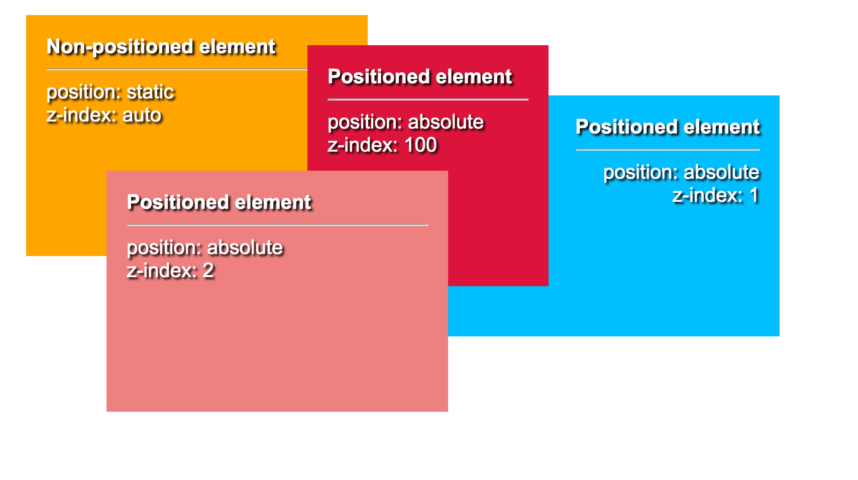 如果 position 不是 static(預設) 情況下,應該預期越大的 z-index 應該會蓋過 z-index 小的,如果沒設定的話,預設為 0